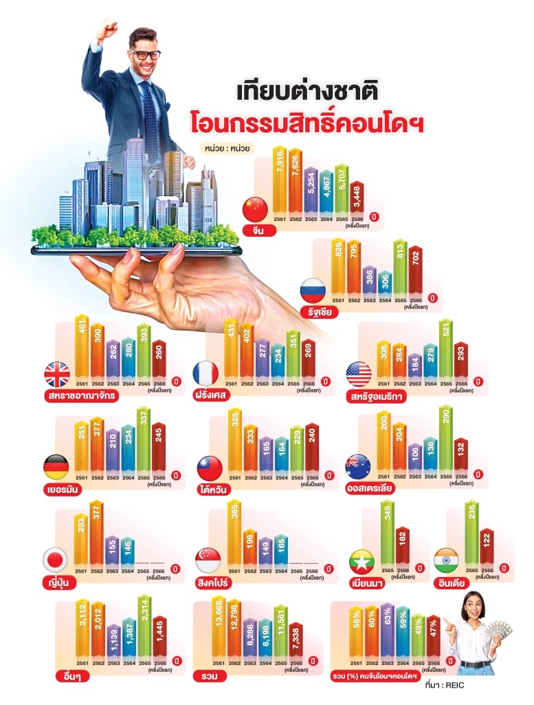 จากข้อมูลการโอนกรรมสิทธิ์คอนโดมิเนียมของชาวต่างชาติในประเทศไทย ช่วงครึ่งแรกของปีพ.ศ.2566ของศูนย์ข้อมูลอสังหาริมทรัพย์ธนาคารอาคารสงเคราะห์ คนจีนยังเป็นกลุ่มผู้ซื้อชาวต่างชาติที่มีการโอนกรรมสิทธิ์คอนโดมิเนียมในประเทศไทยมากที่สุด โดยมีการโอนกรรมสิทธิ์คอนโดมิเนียมไปทั้งหมด 3,448 ยูนิต มูลค่าคอนโดมิเนียมที่มีการโอนกรรมสิทธิ์รวมแล้ว 16,992 ล้านบาท ซึ่งคิดแล้วเป็นสัดส่วนประมาณ 47%ของคอนโดมิเนียมทั้งหมดที่มีการโอนกรรมสิทธิ์โดยชาวต่างชาติในประเทศไทยช่วง 6 เดือนแรกของปีพ.ศ.2566