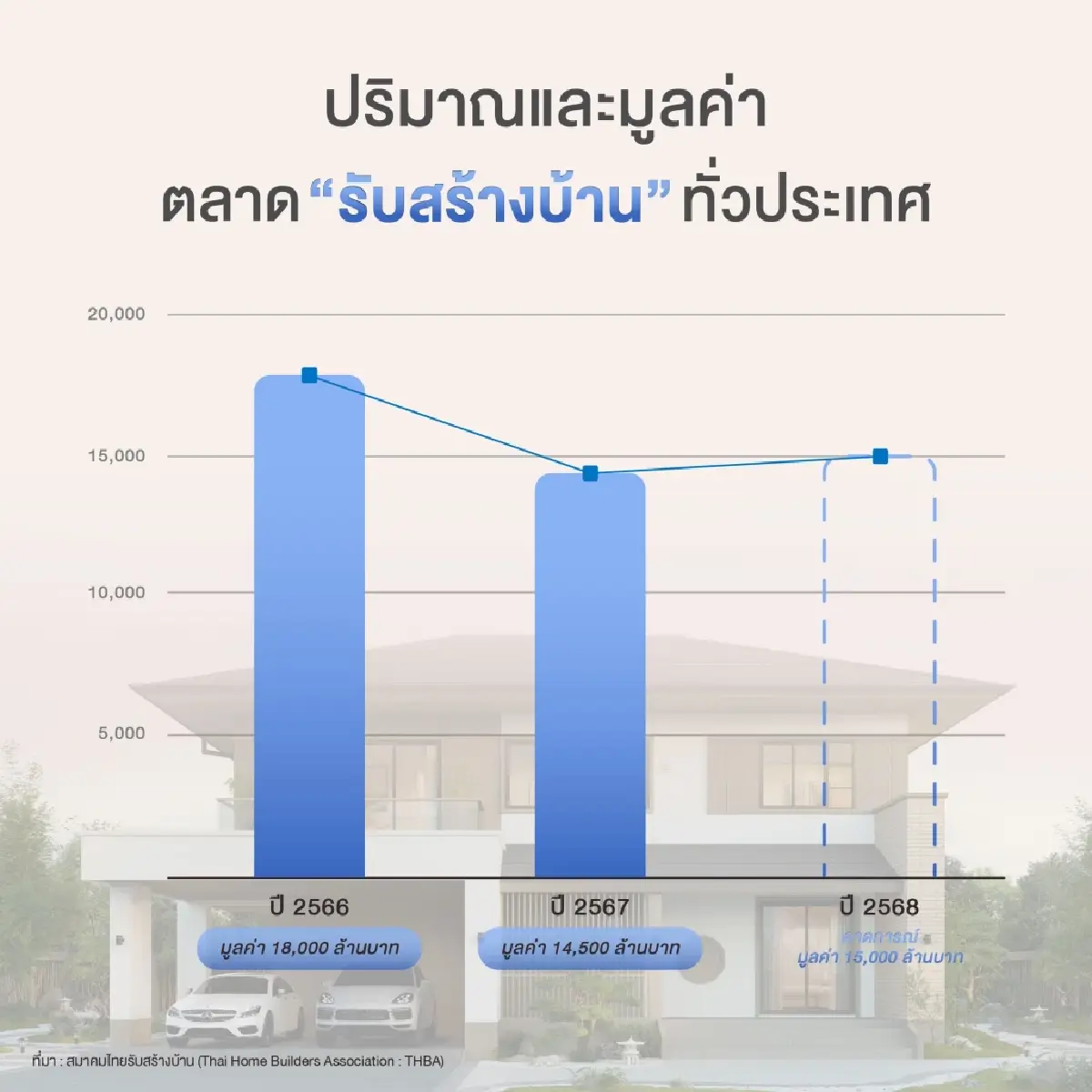 ในส่วนของปริมาณและมูลค่าตลาด “รับสร้างบ้าน” ปี 2568 มีแนวโน้มเป็นไปในทิศทางเดียวกัน คาดมูลค่า 14,000-15,000 ล้านบาท โดยสมาชิก 2 สมาคมมีส่วนแบ่งตลาด 70% เพิ่มขึ้นเล็กน้อย คิดเป็นมูลค่า 10,000-10,500 ล้านบาท