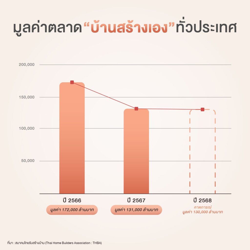 ในปี 2568 คาดปริมาณและมูลค่า “บ้านสร้างเอง” ทั่วประเทศ มีแนวโน้มทรงตัวหรือใกล้เคียง มูลค่าอยู่ที่ 120,000-130,000 ล้านบาทปัจจัยสำคัญที่ทำให้บ้านสร้างเองยังไม่อาจฟื้นตัว ยังคงวนเวียนอยู่กับปัจจัยเดิมๆ กล่าวคือ ปัญหาหนี้ครัวเรือน เศรษฐกิจประเทศที่ฟื้นตัวช้าหรือชะลอตัว กำลังซื้อผู้บริโภคที่ลดลง