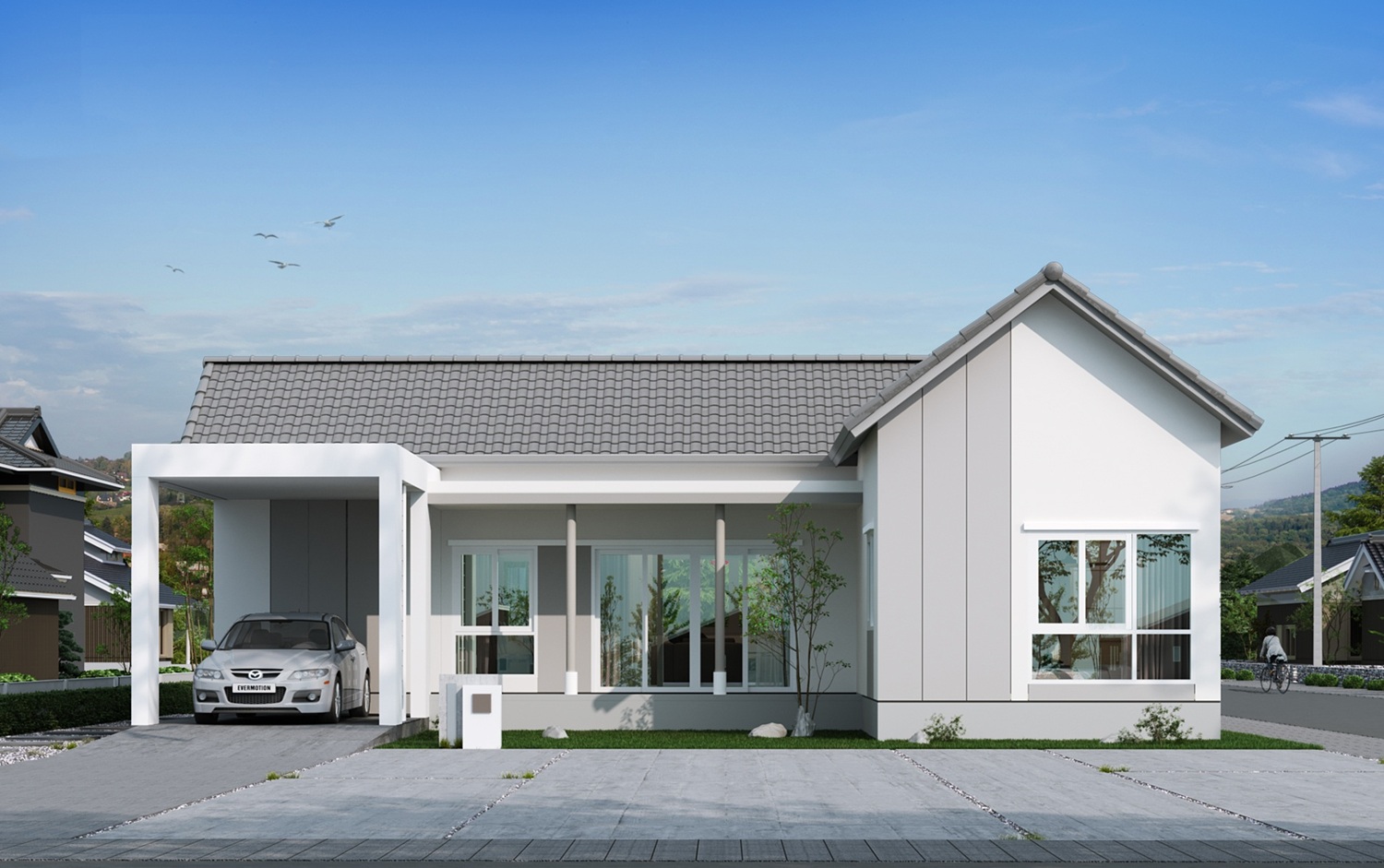 - EA-131 แบบบ้านชั้นเดียวรูปทรงกระทัดรัด พร้อมจัดสรรพื้นที่สีเขียวโดยรอบ สอดรับกับการออกแบบช่องเปิด เพื่อให้ได้สัมผัสกับบรรยากาศจากภายนอก ส่วนฟังก์ชันภายในถูกออกแบบรองรับการใช้งานได้อย่างสมบูรณ์แบบ ประกอบด้วย 2 ห้องนอน 2 ห้องน้ำ ที่จอดรถ 2 คัน พื้นที่ใช้สอย127 ตร.ม.