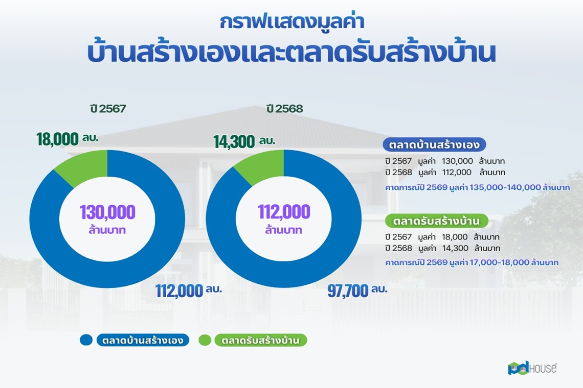 นางสาวจิราภา สุวรรณสุต ประธานเจ้าหน้าที่บริหาร บริษัท พีดีเฮ้าส์ อินเตอร์เนชั่นแนล จำกัด และกลุ่มบริษัท ปทุมดีไซน์ ดีเวลลอป เปิดเผยว่า ในปี 2568 ที่ผ่านมา ธุรกิจรับสร้างบ้านต้องเผชิญกับ "พายุสมบูรณ์แบบ" (Perfect Storm) ทั้งจากโครงสร้างเศรษฐกิจมหภาคที่ฟื้นตัวล่าช้า ปัญหาหนี้ครัวเรือนที่พุ่งสูงแตะระดับร้อยละ 90 ของ GDP รวมถึงสถานการณ์ความไม่สงบตามแนวชายแดน ซึ่งส่งผลกระทบโดยตรงต่อความเชื่อมั่นในการลงทุนระยะยาวของผู้บริโภค จากการเก็บข้อมูลพบว่ามูลค่าตลาดบ้านสร้างเองในปี 2568 ลดลงเหลือเพียง 112,000 ล้านบาท (จาก 130,000 ล้านบาทในปี 2567) ขณะที่ตลาดรับสร้างบ้าน (ดำเนินการโดยบริษัทรับสร้างบ้าน) หดตัวลงถึง 21% โดยมีมูลค่าอยู่ที่ 14,300 ล้านบาท นับเป็นการถดถอยที่รุนแรงที่สุดในรอบหลายปี