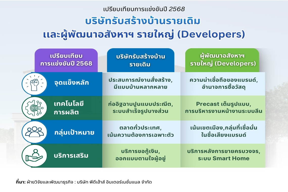 หนึ่งในไฮไลท์สำคัญของปี 2568 คือการที่บริษัทพัฒนาอสังหาริมทรัพย์รายใหญ่ (Listed Companies) นำโดย แสนสิริ และ พฤกษา โฮลดิ้ง หันมารุกตลาดรับสร้างบ้านบนที่ดินลูกค้าอย่างเต็มตัว เพื่อระบายศักยภาพด้านการผลิตและวิศวกรรมในช่วงที่ตลาดบ้านจัดสรรชะลอตัว ปรากฏการณ์นี้ทำให้ตลาดมีการแข่งขันที่ "ยกระดับ" ขึ้นทันที โดยรายใหญ่พยายามนำเทคโนโลยี Precast มาปรับใช้เพื่อความรวดเร็ว ขณะที่บริษัทรับสร้างบ้านดั้งเดิมต้องชูจุดเด่นเรื่อง "ความประณีต" และ "การออกแบบที่ตอบโจทย์เฉพาะบุคคล" นอกจากนี้การเข้ามาของแบรนด์ระดับมหาชนช่วยลดความกังวลเรื่อง "ผู้รับเหมาทิ้งงาน" ซึ่งจะกลายเป็นบรรทัดฐานใหม่ที่ผู้ประกอบการทุกรายต้องสร้างความมั่นใจในระดับสูงสุดจึงจะอยู่รอดได้
